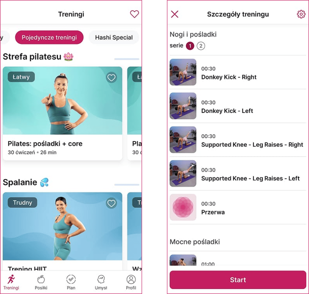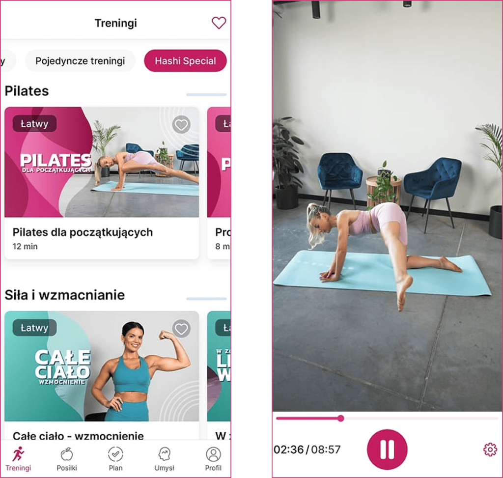 Niezależnie od tego, czy wybierzesz programy, pojedyncze trening, czy ćwiczenia z Hashi Special — zawsze otrzymasz kompleksowe wskazówki do wykonania ćwiczenia i motywacje. Dokładnie tak jak na indywidualnej sesji treningowej!