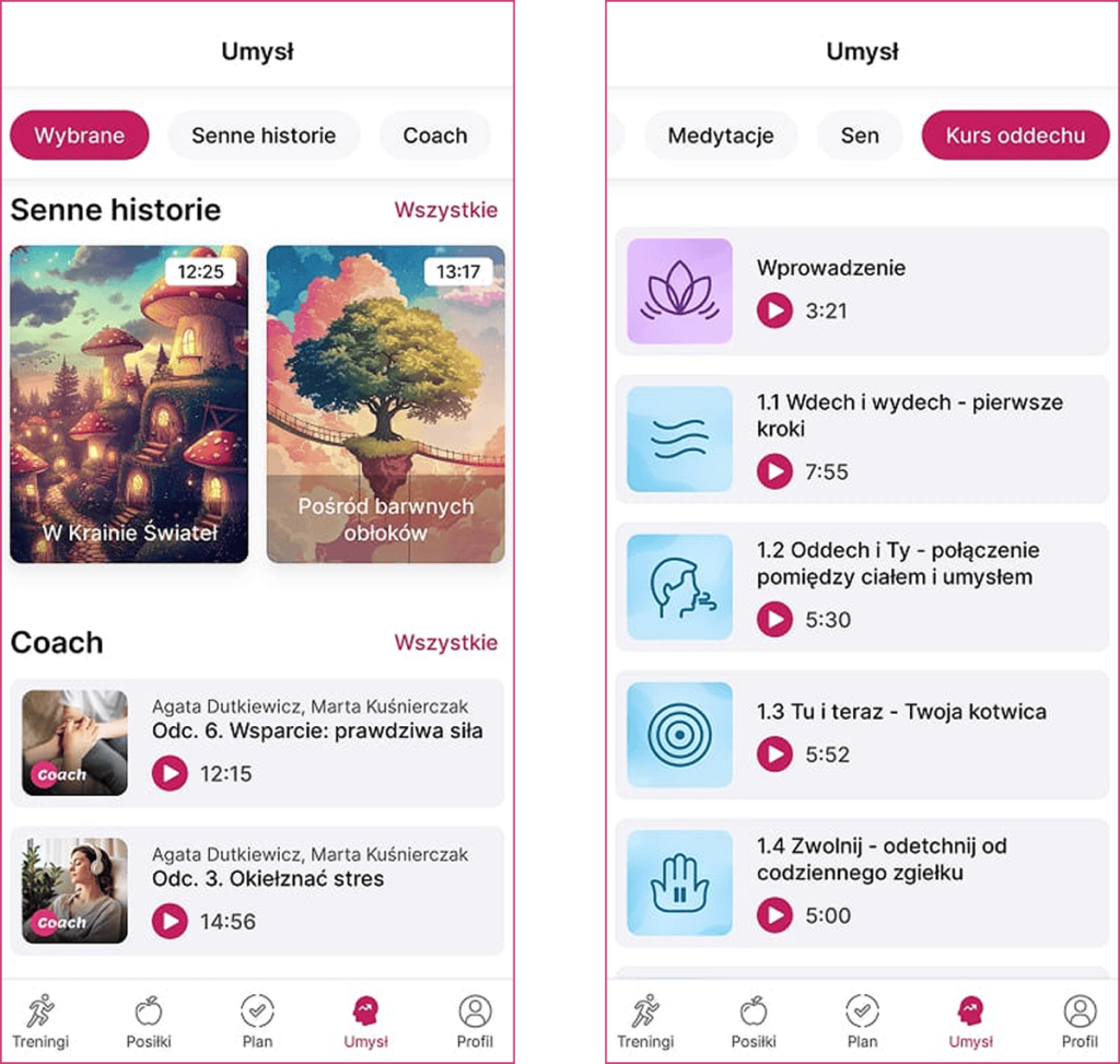 Lepszy sen? Sięgnij po „Senne historie” lub kojące ścieżki dźwiękowe w sekcji „Sen”. Pomogą Ci się wyciszyć i głęboko zregenerować.