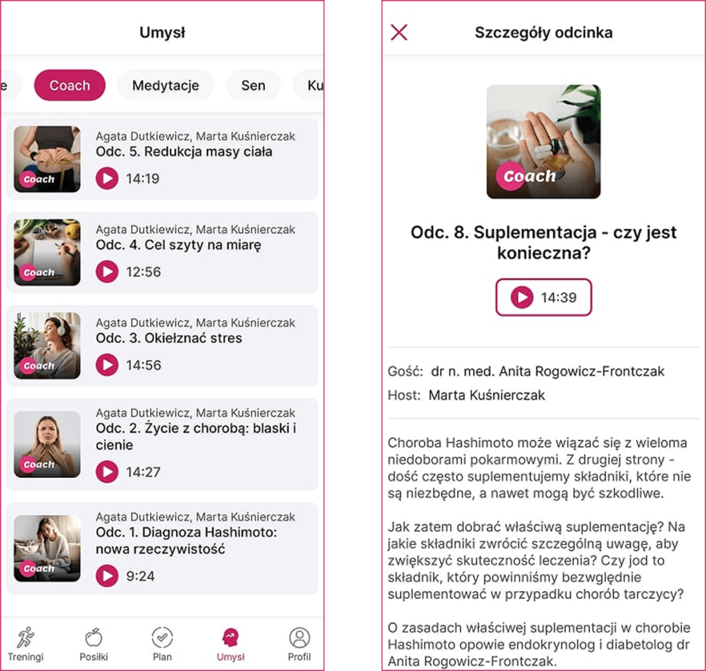 W zakładce “Umysł” znajdziesz specjalistyczne podcasty na temat endokrynologii (z dr n.med. Anitą Rogowicz – Frontczak) oraz psychologii i dietetyki (z dr n. med. Agatą Dutkiewicz).