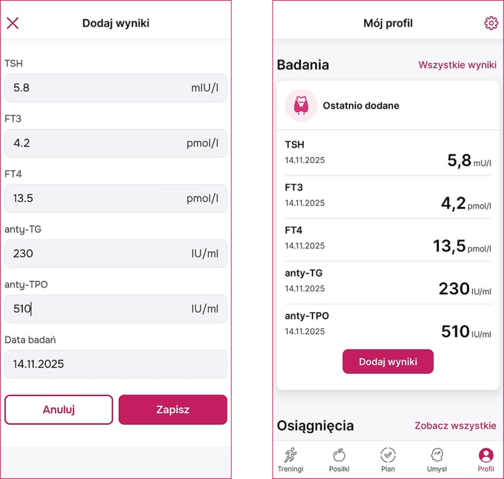 Kontrola Wyników Badań: Wprowadzaj i przechowuj wyniki (np. TSH, fT3, fT4, przeciwciała) w jednym, bezpiecznym miejscu. Obserwuj trendy, analizuj i idź na wizytę lekarską doskonale przygotowana.