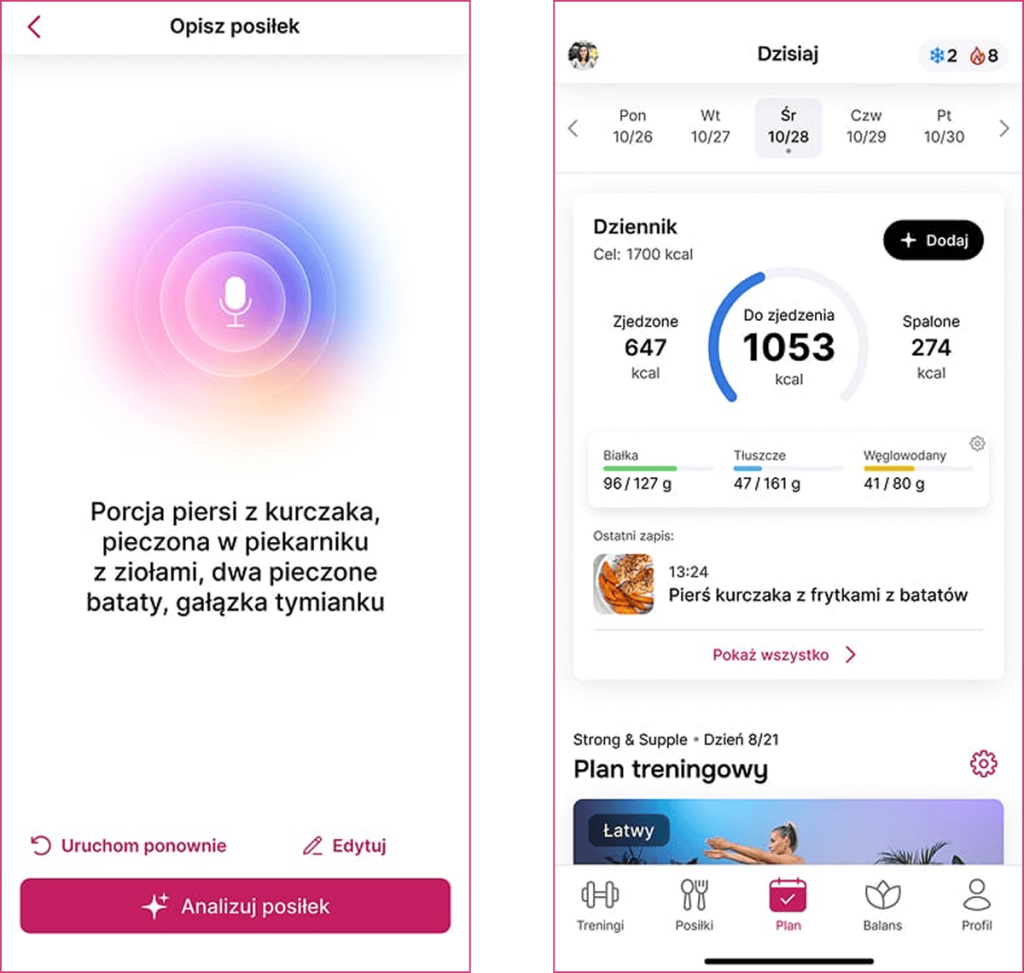 Każdy posiłek możesz dodać do Dziennika jednym zdjęciem. Także ten spoza planu diety w aplikacji! Bez ważenia porcji, bez szukania produktów w bazie. Zdjęcie lub skan kodu kreskowego wystarczą. Dostajesz rozpisane kalorie, makro i gotowy wpis w Dzienniku.